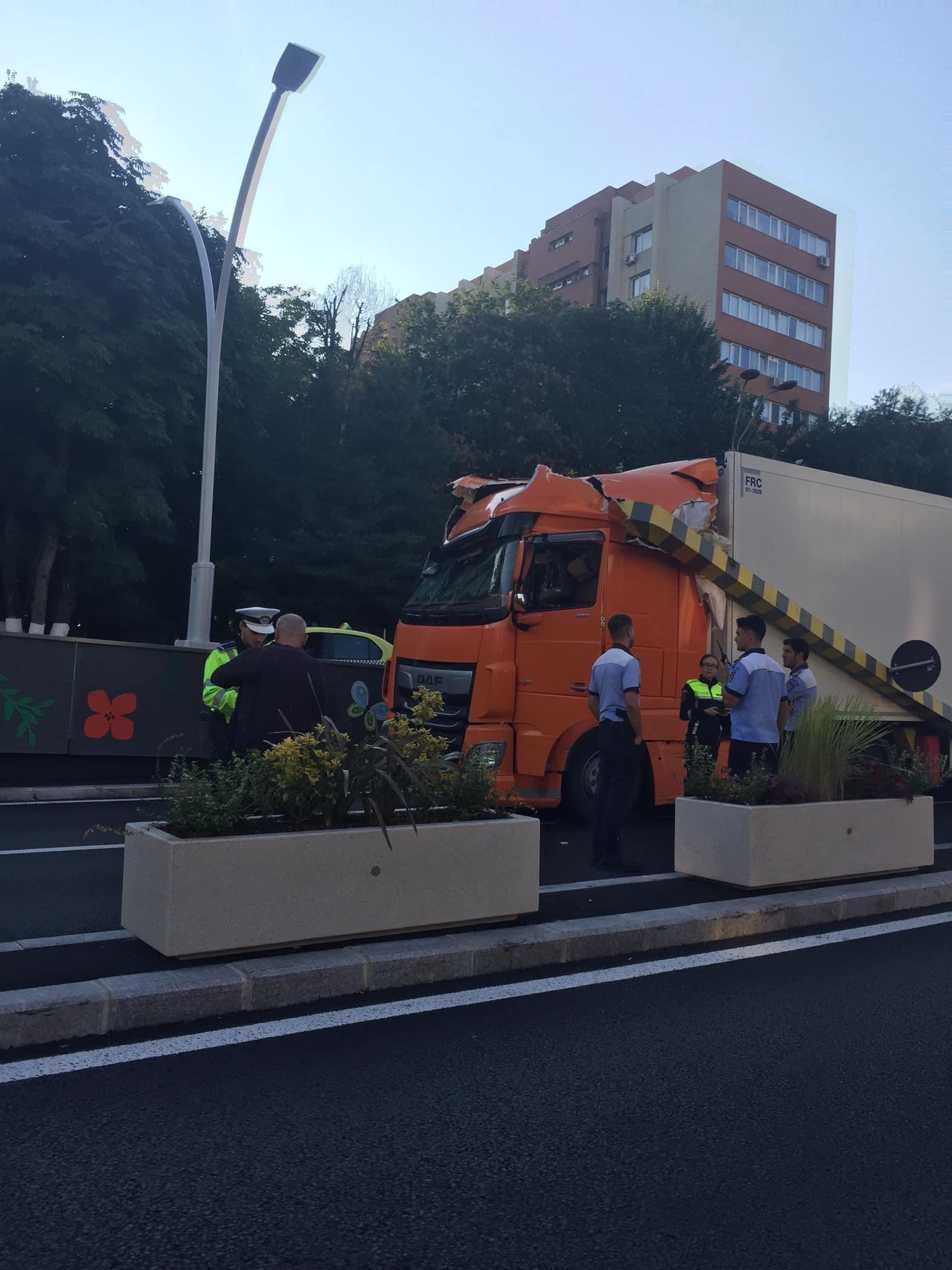 TIR blocat în Pasajul Unirii din Capitală, proaspăt reabilitat. Autotrenul a rupt limitatorul de înăltime
