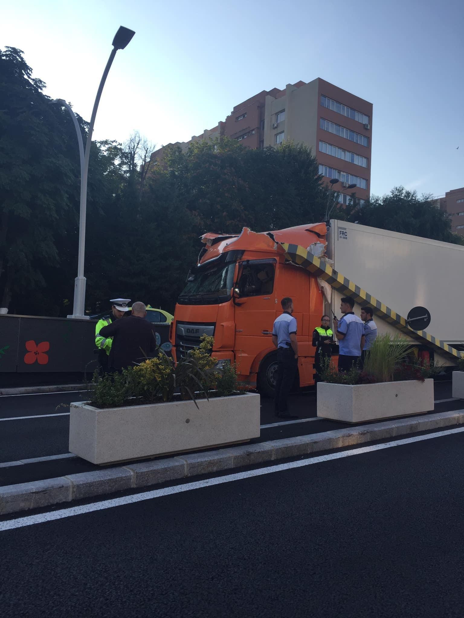 TIR blocat în Pasajul Unirii din Capitală, proaspăt reabilitat. Autotrenul a rupt limitatorul de înăltime
