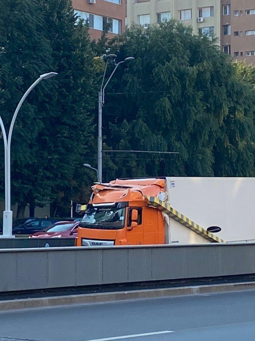TIR blocat în Pasajul Unirii din Capitală, proaspăt reabilitat. Autotrenul a rupt limitatorul de înăltime
