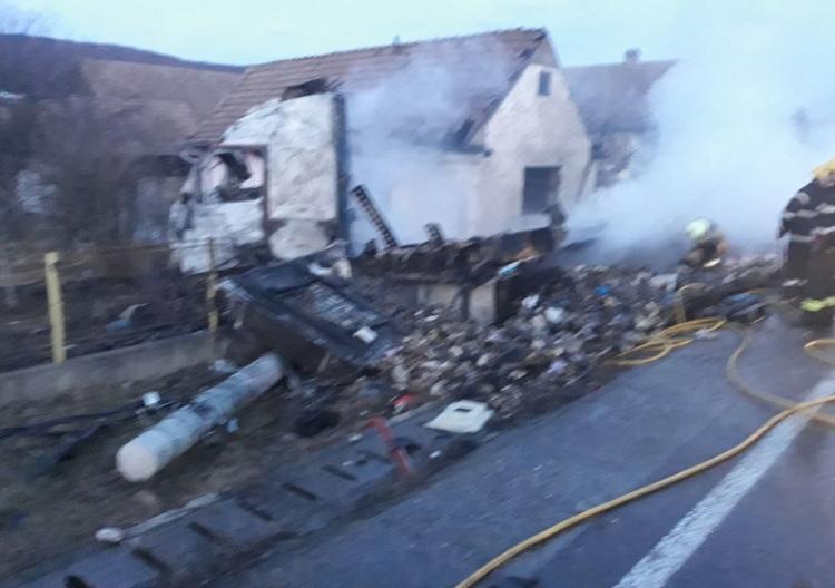 Tir cu ciocolata, în flăcări după ce s-a răsturnat pe un drum din Mureş. Focul uriaş a apris şi o casă (Video)