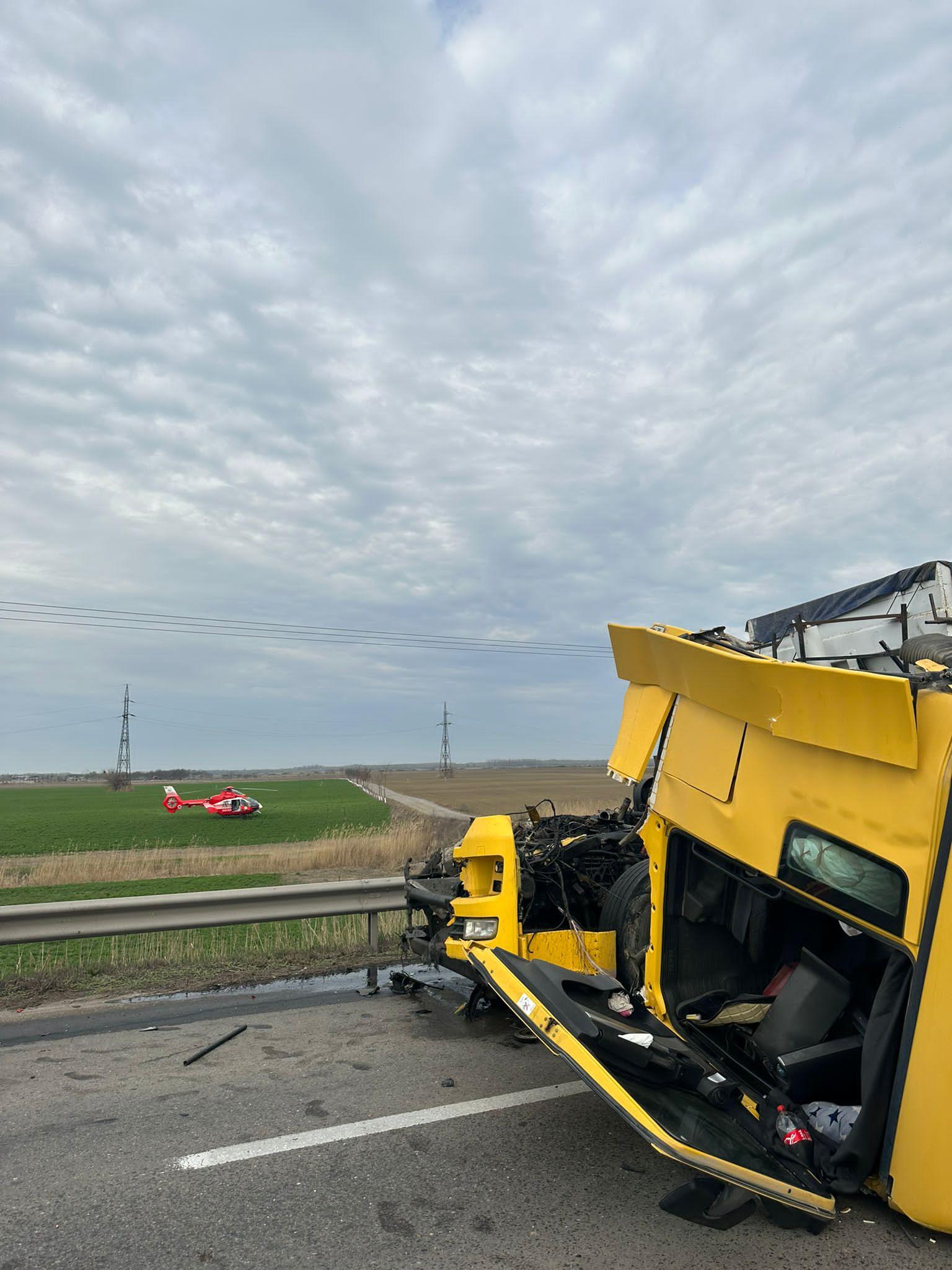 TIR dezmembrat pe un drum din Brăila, după un carambol cu un alt camion și o mașină. Cabina s-a rupt de pe șasiu