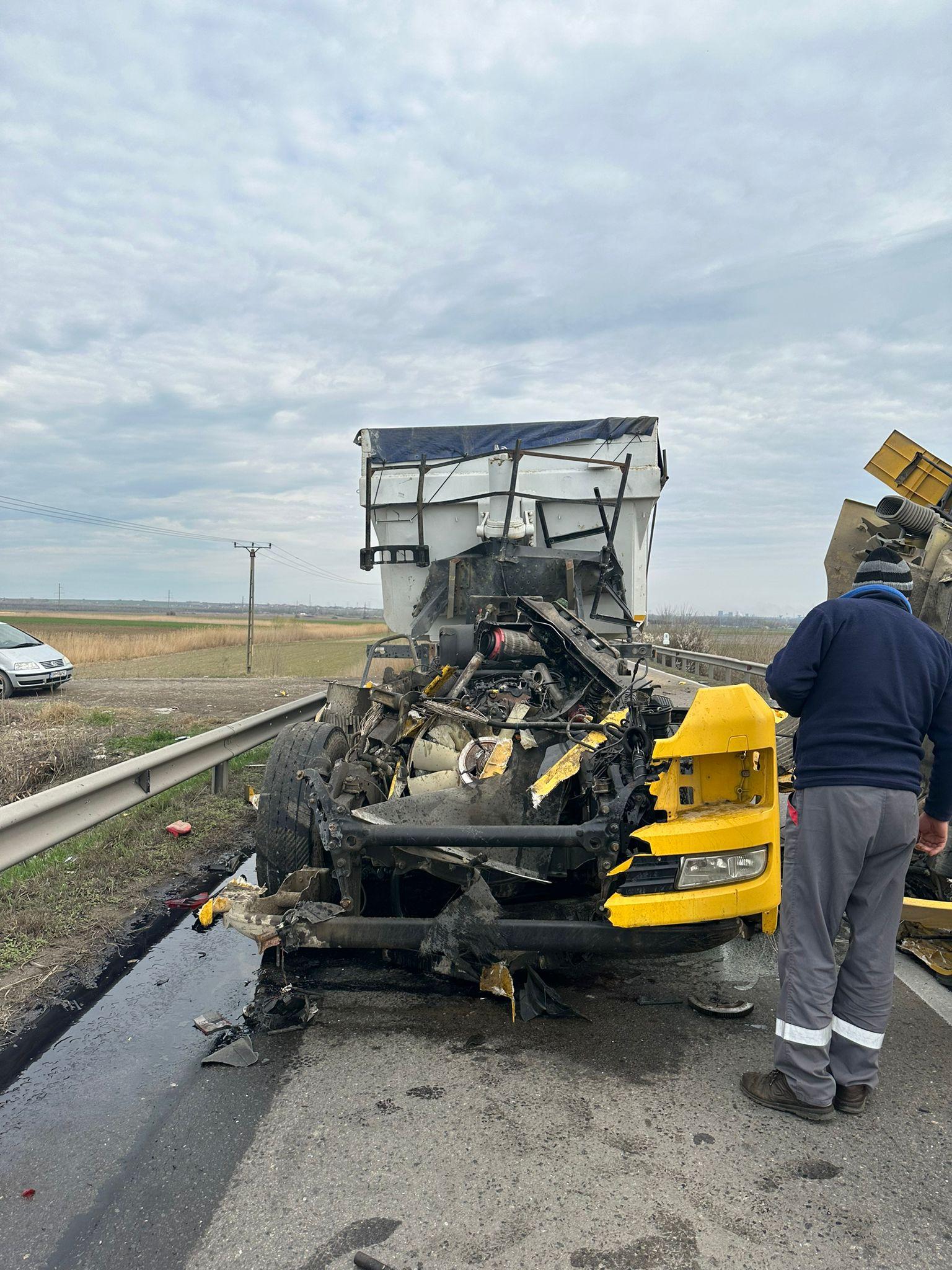 TIR dezmembrat pe un drum din Brăila, după un carambol cu un alt camion și o mașină. Cabina s-a rupt de pe șasiu