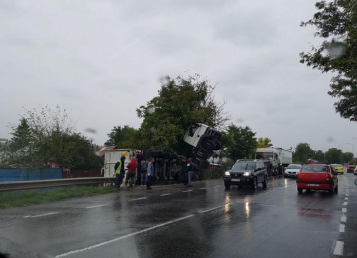 TIR încărcat cu floarea-soarelui, răsturnat pe şosea la Târgu Frumos. Mastodontul s-a oprit într-o curte