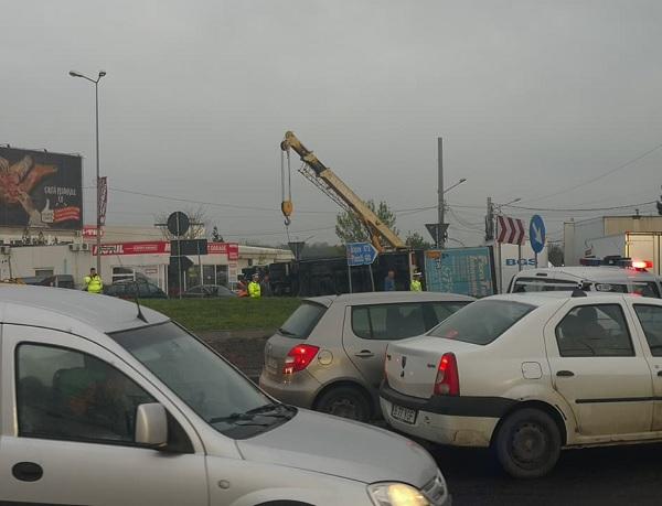 TIR răsturnat în giratoriul de la Mogoşoaia. Trafic paralizat pe Centura Capitalei, poliţiştii au adus macarale pentru a scoate din drum autotrenul (Foto)