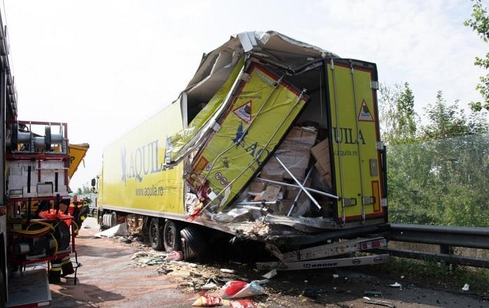 Accident grav cu un TIR românesc, pe o autostradă din Austria. Imagini teribile, după impactul cu un alt camion (video)