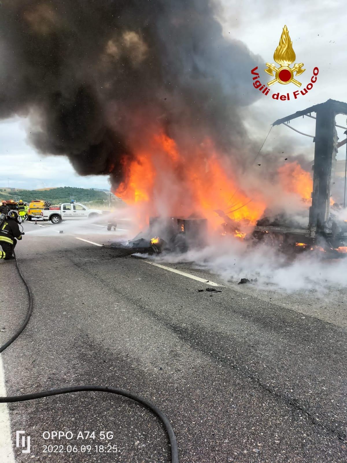 TIR românesc în flăcări, pe o autostradă din Italia. Camionul plin cu baterii auto uzate a luat foc în mers
