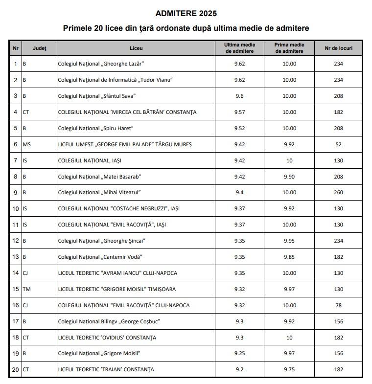Top 20 licee din țară după ultima medie de admitere. Colegiul Național "Gheorghe Lazăr" a urcat pe primul loc