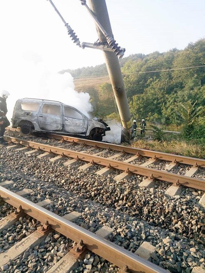 O maşină a doborât un stâlp şi a luat foc pe calea ferată! Trafic feroviar şi rutier paralizat în Bacău