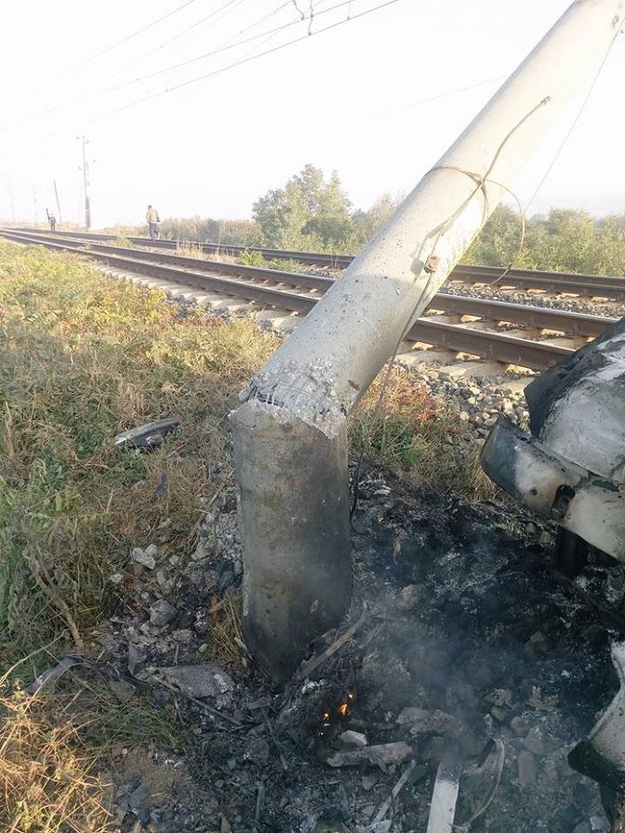 O maşină a doborât un stâlp şi a luat foc pe calea ferată! Trafic feroviar şi rutier paralizat în Bacău