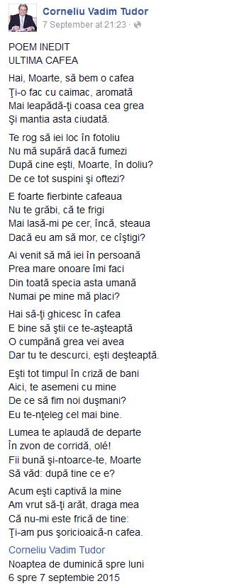 ULTIMA postare de pe Facebook a lui Vadim Tudor: "Hai, Moarte, să bem o cafea"