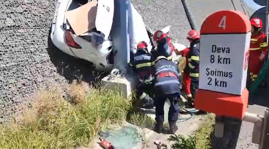 Un bărbat a fost la un pas de moarte, după ce a ieşit cu maşina de pe o şosea din Hunedoara şi s-a izbit direct în zid. Autoturismul a rămas "parcat"