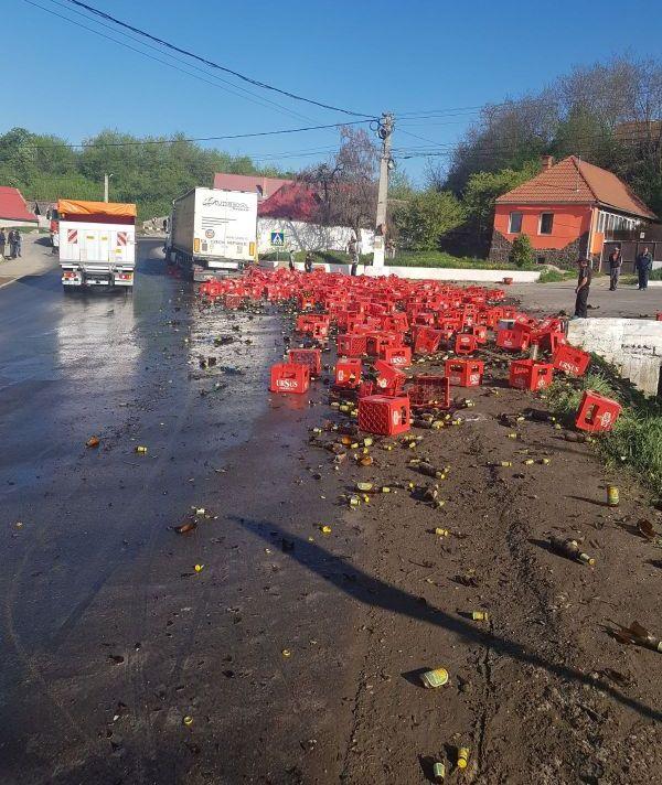 Un camion încărcat cu bere şi-a vărsat încărcătura în curbă la Feldioara. Localnicii au venit imediat să ajute