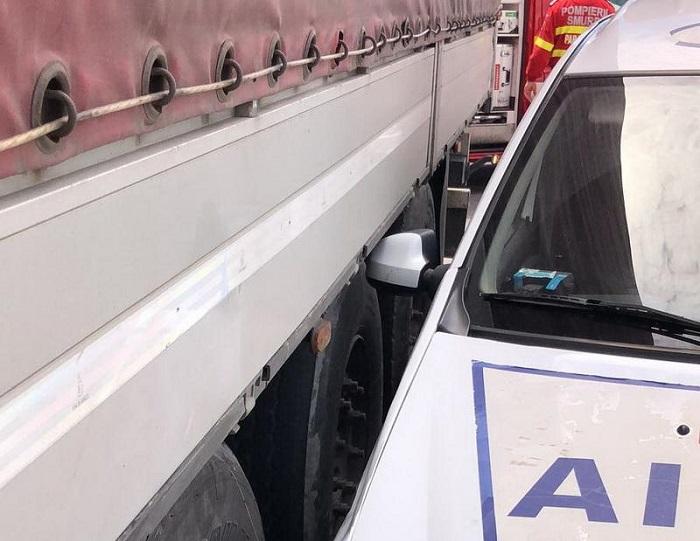 Un poliţist de la rutieră a fost lovit de un camion într-un sens giratoriu, aproape de vama Borş (video)