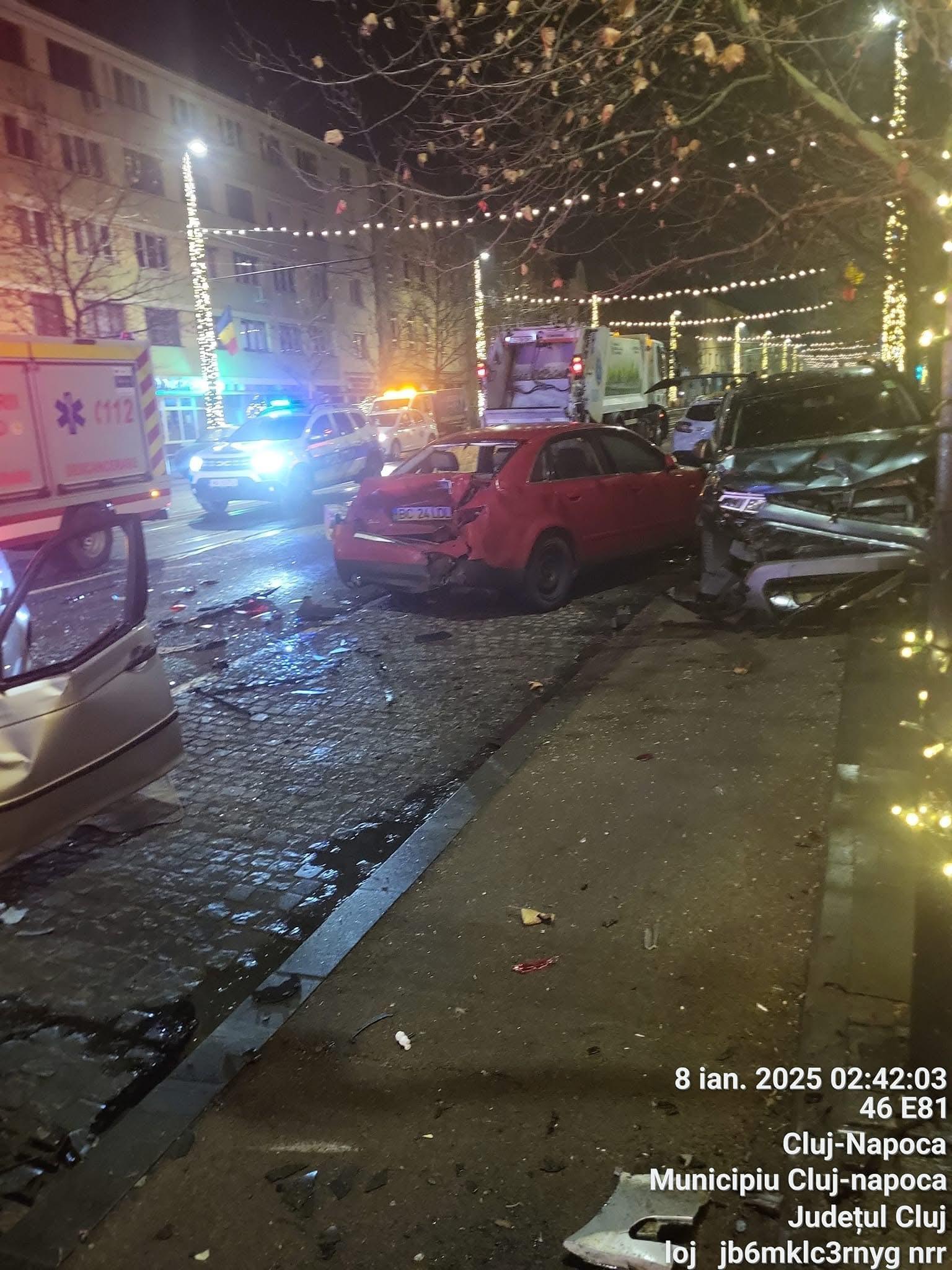 Un şofer beat a lovit ca la popice trei maşini parcate în centrul Clujului. Un tânăr de 18 ani a ajuns la spital