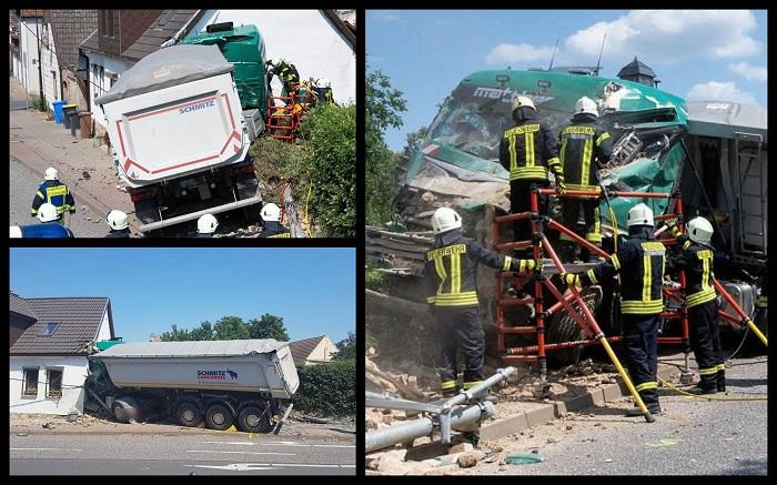 Un şofer de camion a intrat cu basculanta în casa unui alt şofer de camion, în Germania. Imagini teribile de la locul accidentului