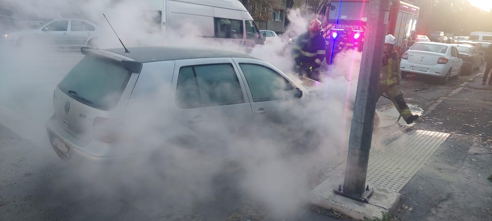 Un VW Golf a început să ardă în mers, pe o stradă din Oradea. Șoferul a reușit să iasă singur din mașină