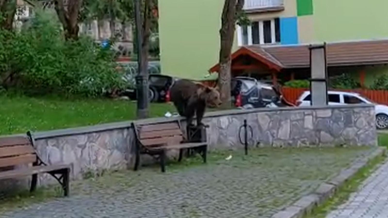 Urs filmat plimbându-se nestingherit prin Băile Tuşnad. Animalul s-a aşezat pe o bancă, să se odihnească