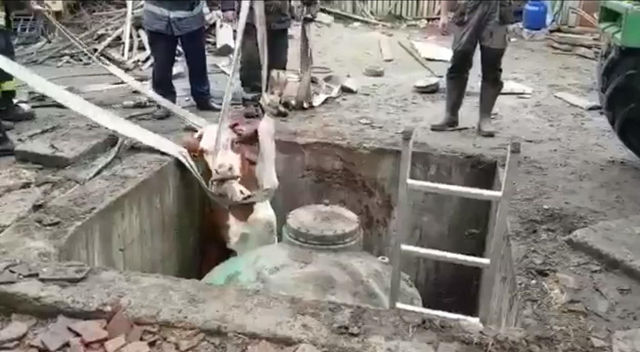 Operaţiune dramatică a pompierilor din Covasna, după ce o vacă a căzut într-un canal. Au scos animalul după mai bine de o oră de chin (Video)
