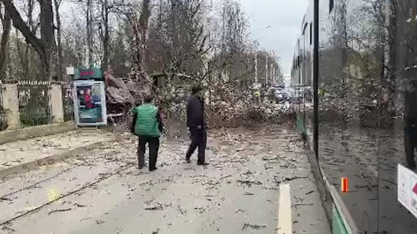 Vântul puternic a prăbușit un copac peste o stație de tramvai din Iași. Speriați, oamenii au fugit să se adăpostească