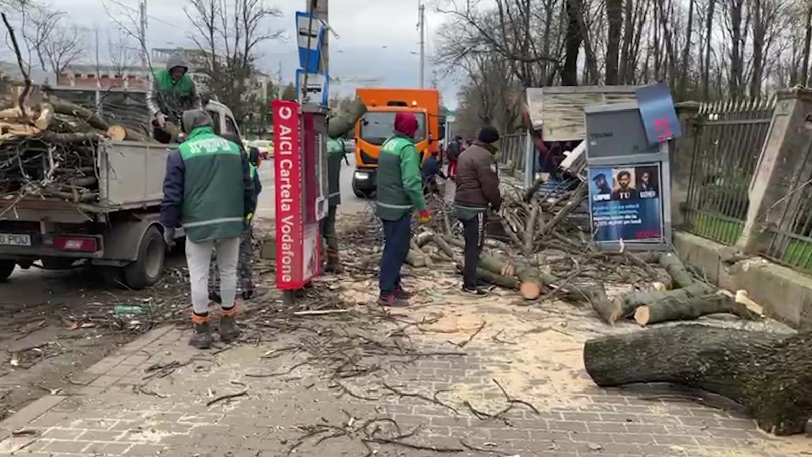 Vântul puternic a prăbușit un copac peste o stație de tramvai din Iași. Speriați, oamenii au fugit să se adăpostească