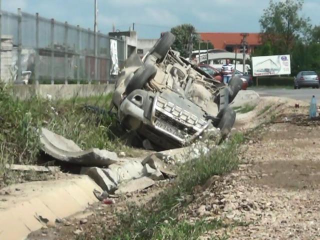 Trafic blocat pe A3. Un TIR încărcat cu piatra s-a răsturnat după ce a lovit glisiera dintre sensuri