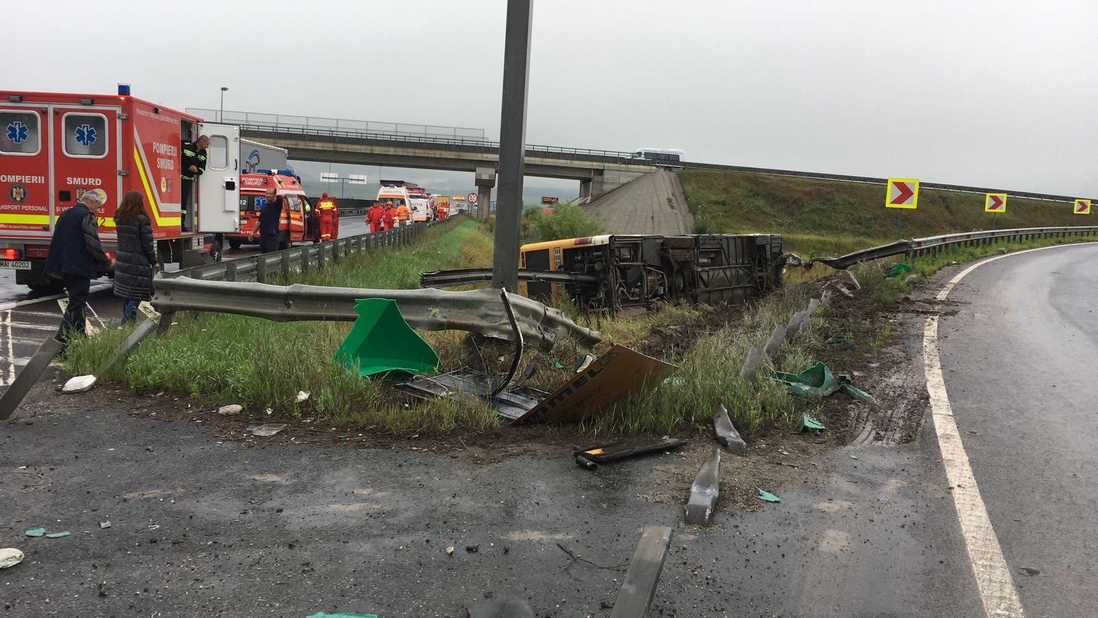 Video de la accidentul teribil din Sibiu. 32 de muncitori au fost răniţi, după ce autobuzul în care se aflau s-a răsturnat lângă aeroport