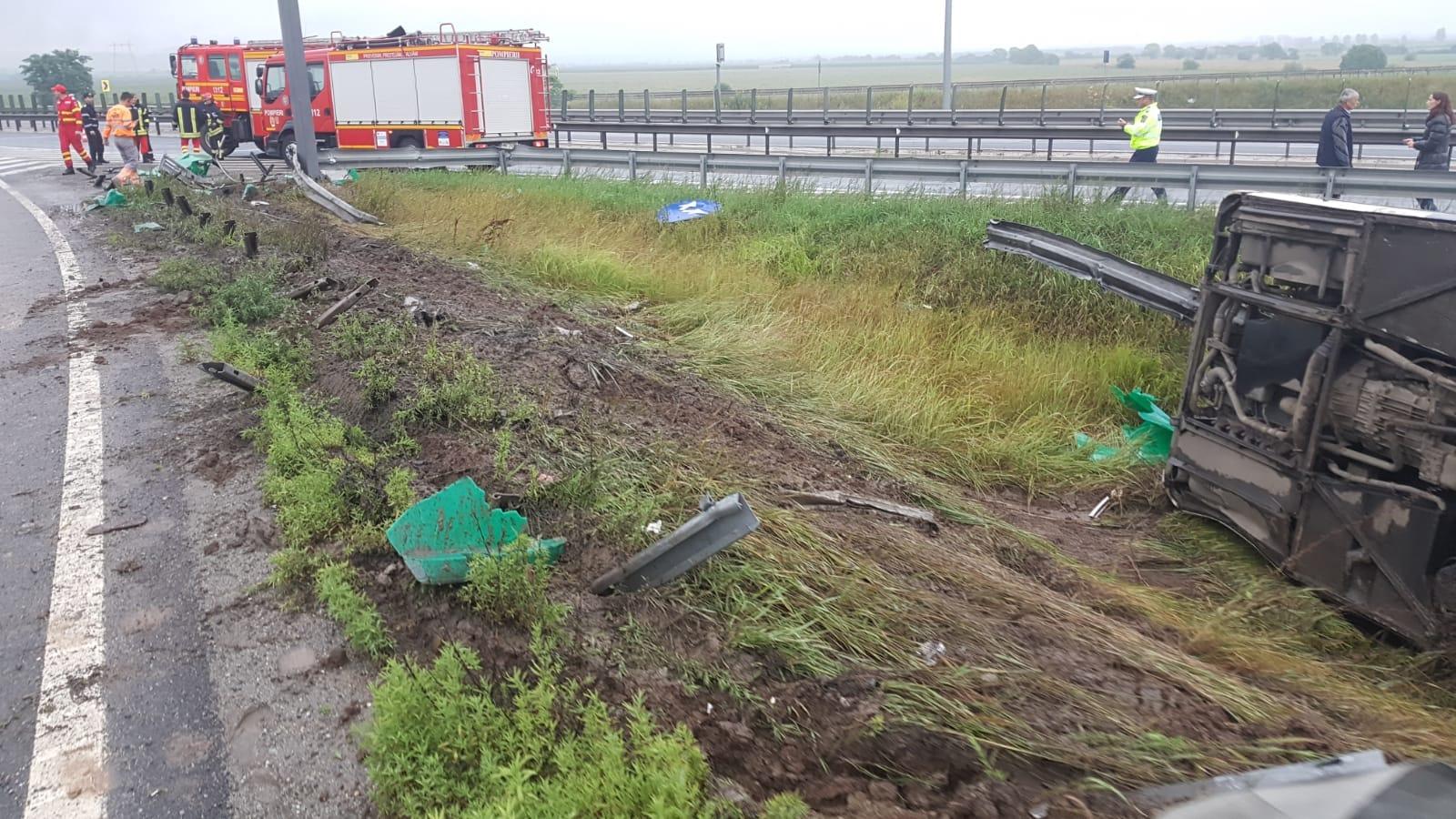 Video de la accidentul teribil din Sibiu. 32 de muncitori au fost răniţi, după ce autobuzul în care se aflau s-a răsturnat lângă aeroport
