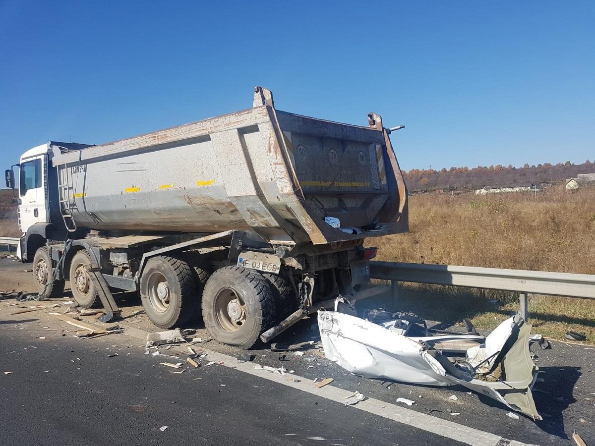 Video cu momentul impactului dintre un TIR şi o basculantă, pe autostrada Sibiu-Sebeş