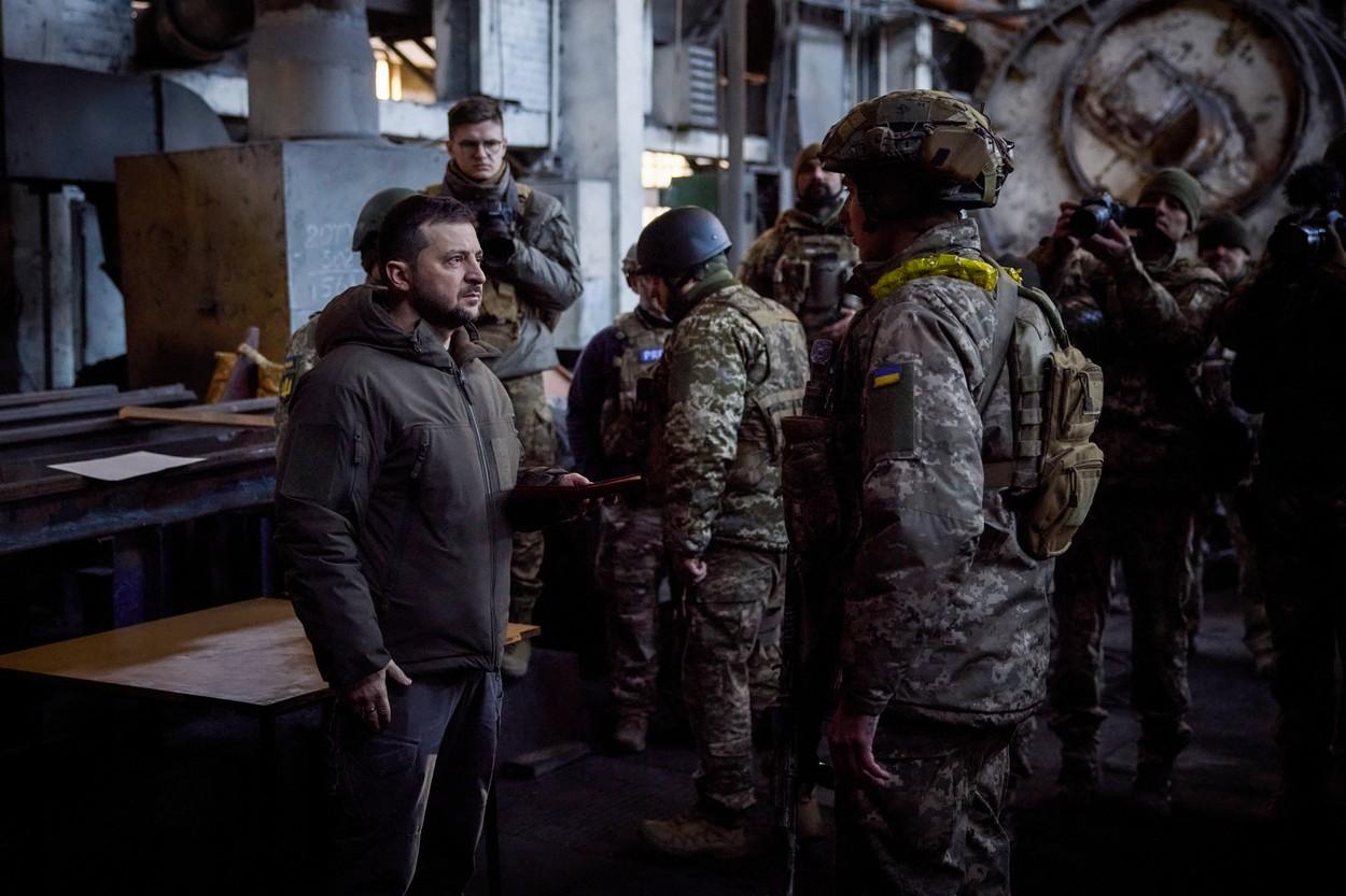 Volodimir Zelenski, vizită în oraşul Bahmut. S-a întâlnit cu militarii şi a decorat soldaţii pe linia frontului