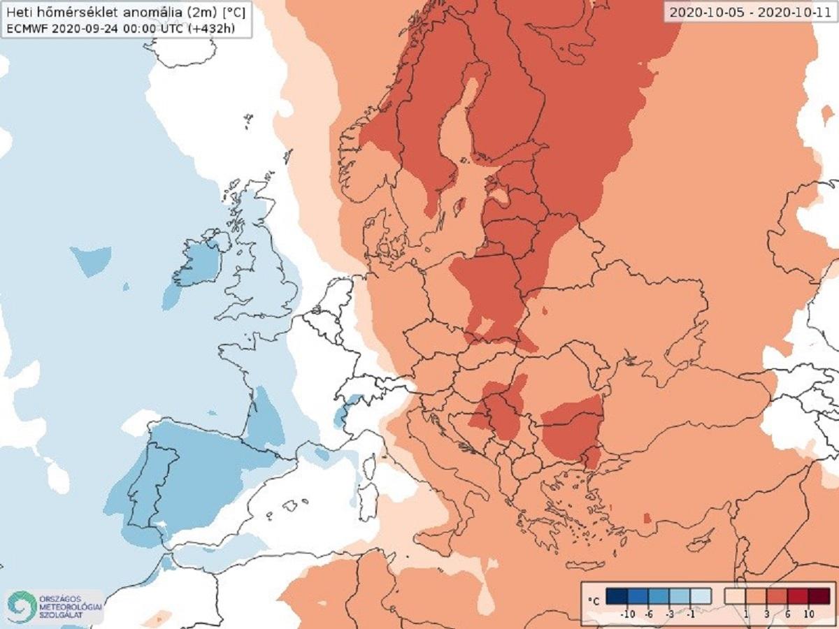 Regimul temic din perioada 5 - 11 octombrie. Nuanțele de roșu scot în evidență regiunile unde va fi mai cald (Muntenia, sudul Olteniei, Banat) | Sursa foto: met.hu/