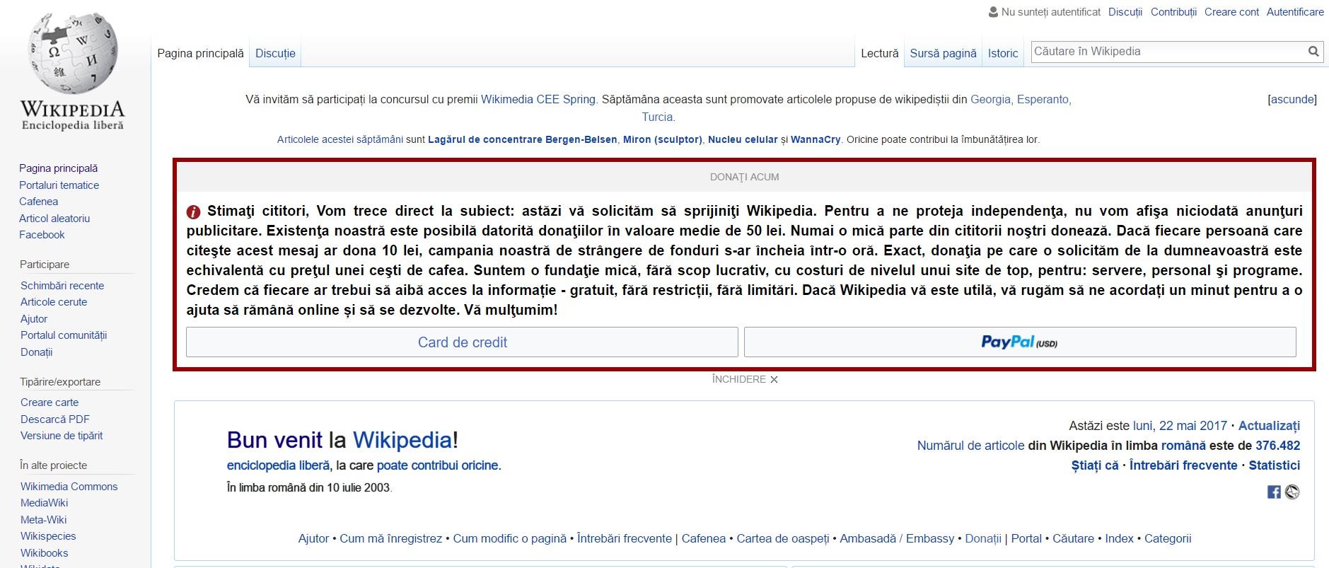 Wikipedia le cere bani românilor: "Vom trece direct la subiect: astăzi vă ... "
