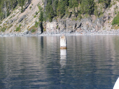 Lacul Crater este al nouălea cel mai adânc lac din lume, încât Statuia Libertăţii şi Turnul Eiffel ar putea fi puse sub trunchi şi nu ar atinge fundul lacului. Datând de acum 450 de ani, buşteanul pare că încalcă legile fizicii.