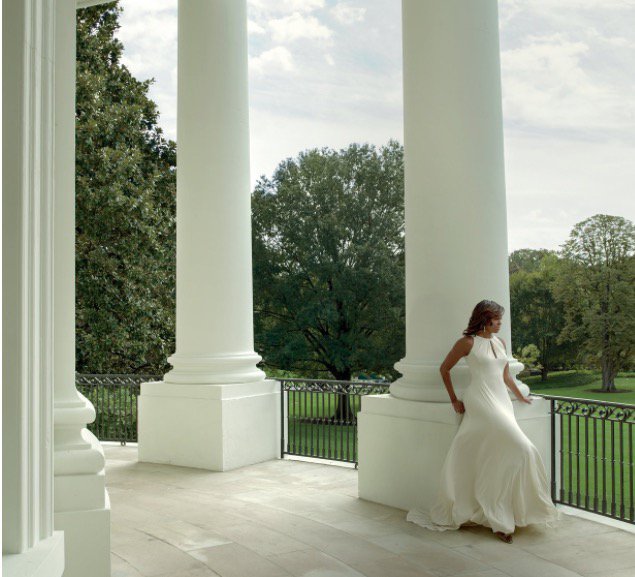 Coperta o înfăţişează pe Michelle Obama pe una din peluzele grădinii Casei Albe, cu părul lăsat liber, într-o rochie albă eterică de mătase, marca Carolina Herrera, fără umeri, cu coatele sprijinite pe un pat de flori.
