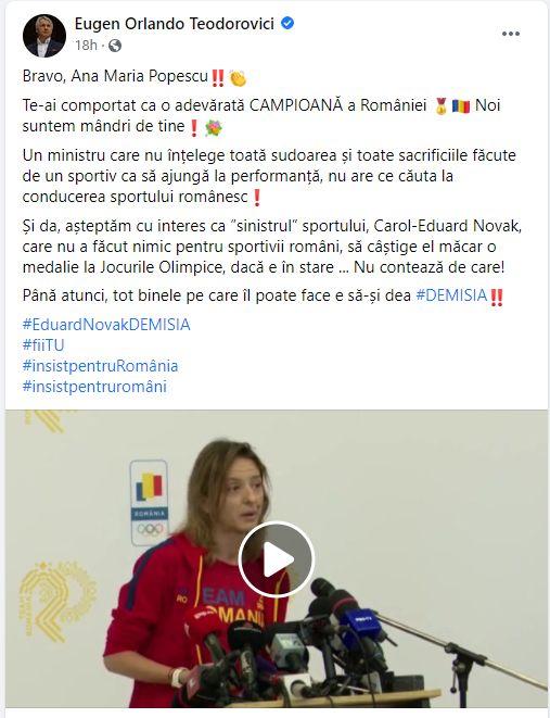 „Bravo, Ana Maria Popescu! Te-ai comportat ca o adevărată campioană a României Noi suntem mândri de tine! Un ministru care nu înțelege toată sudoarea și toate sacrificiile făcute de un sportiv ca să ajungă la performanță, nu are ce căuta la conducerea sportului românesc! Și da, așteptăm cu interes ca <sinistrul> sportului, Carol-Eduard Novak, care nu a făcut nimic pentru sportivii români, să câștige el măcar o medalie la Jocurile Olimpice, dacă e în stare ... Nu contează de care", a scris Eugen Teodorovici pe pagina sa de Facebook.