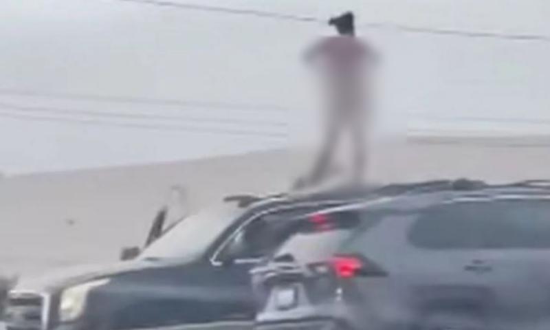 Femeia în vârstă de 35 de ani a ieşit prin trapa maşinii şi s-a urcat pe capotă. Îmbrăcată iniţial într-o pereche de pantaloni gri şi un tricou alb, aceasta a renunţat rapid la haine şi a rămas în pielea goală.