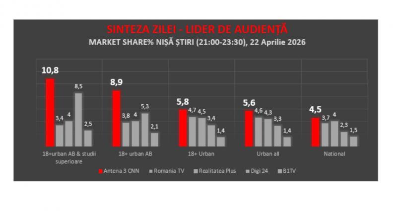 Dovada interesului românilor pentru ceea ce se întâmplă în România și în lume dar și a încrederii pe care o au în Antena 3 CNN au fost audiențele înregistrate de-a lungul întregii zile. Astfel, pe orice target Antena 3 CNN a fost liderul pieței de stiri din România. Pe segmentul 25-59 Urban, postul a înregistrat 5,4% share pe Whole Day, peste Digi24, România TV sau Realitatea Plus. Ordinea s-a repetat pe toate targeturile inclusiv 18 plus urban sau 25-59 urban ABC.