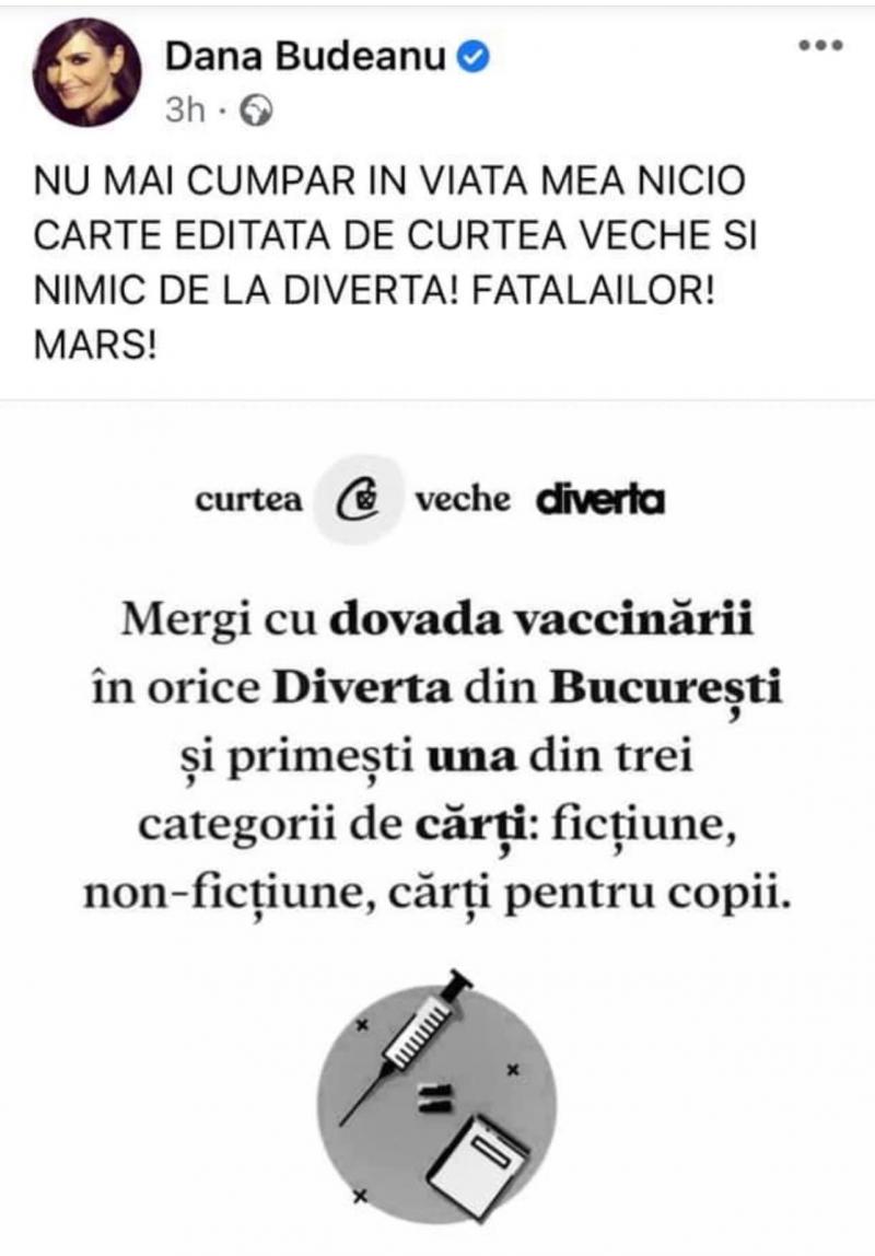 La scurt timp după ce un lanţ de librării a anunţat că va oferi o carte gratuită celor care prezintă adeverinţa de vaccinare, Dana Budeanu a avut o reacţie dură pe pagina sa de Facebook, anunţând că nu va mai cumpăra nicio carte nici de la editură şi nici din librărie.