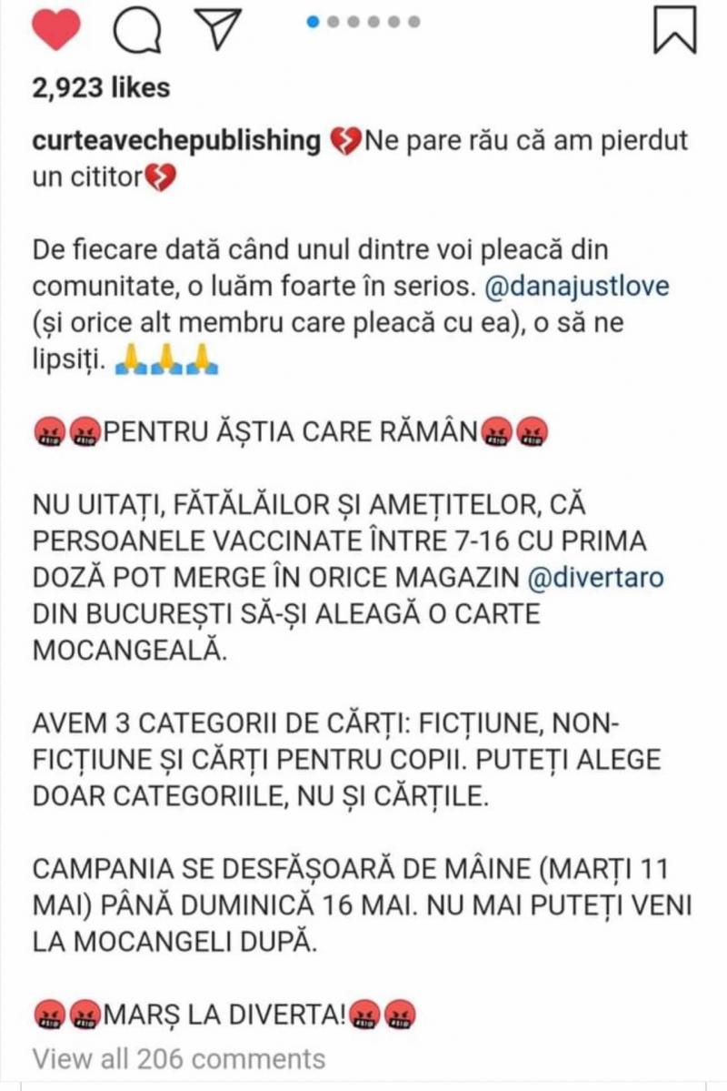 Un mesaj asemănător pro vaccinare a venit şi de la editura Curtea Veche Publishing, pe aceeaşi reţea de socializare.