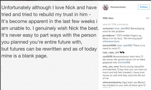 ''Din păcate chiar dacă îl iubesc pe Nick și am tot încercat să refac încrederea mea în el, a devenit evident în ultimele săptămâni că nu sunt capabilă de acest lucru. Îi doresc cu adevărat lui Nick mult succes. Nu este ușor să te desparți de persoana cu care ți-ai făcut planuri să îți petreci viitorul, însă viitorul poate fi rescris, iar al meu astăzi este o pagină goală'', a postat pe contul său de Instagram interpreta australiană în vârstă de 26 de ani.