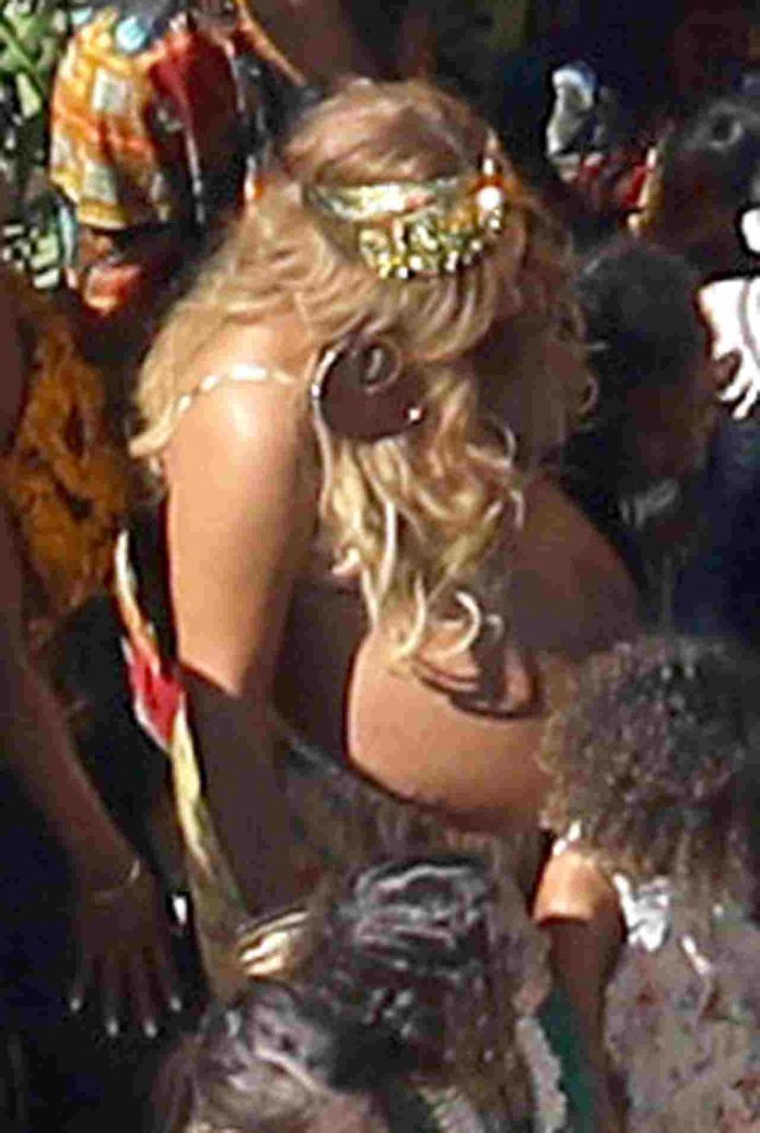 În imagini, se poate observa că Beyonce are o burtică de gravidă impresionantă, ea fiind îmbrăcată în costum de baie şi cu o fustă africană.