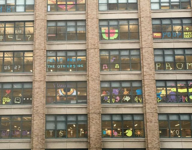 Un angajat al unei firme de publicitate – Harrison and Star – a scris un simplu “Hi/Bună” (din post-it-uri) pe geamul biroului său situat în clădirea de la numărul 75 de pe strada Varick Street, din New York.