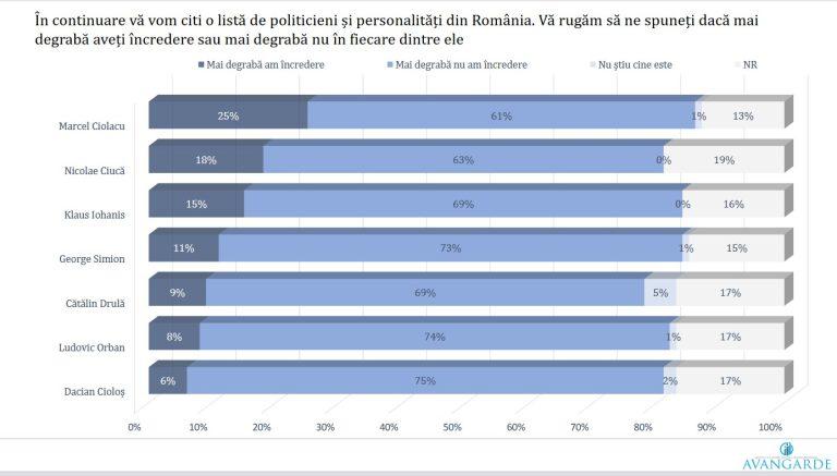 Liderul AUR George Simion are o cotă de încredere de 11%, în timp ce preşedintele USR, Cătălin Drulă, adună 9%. Ludovic Orban (8%) şi Dacian Cioloş (6%) ocupă ultimele poziţii.