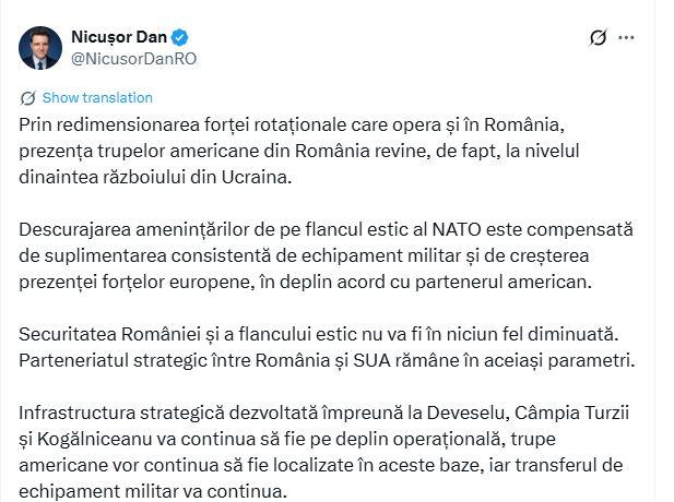Președintele Nicușor Dan a transmis că redimensionarea forței rotaționale americane în România nu afectează securitatea națională, precizând că prezența trupelor revine la nivelul de dinaintea războiului din Ucraina, iar parteneriatul strategic cu Statele Unite rămâne neschimbat.
