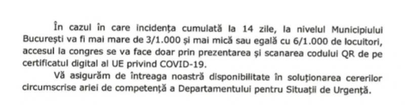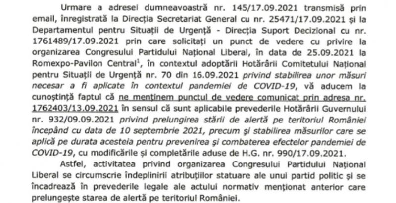 În răspunsul datat 20 septembrie şi transmis PNL cu privire la condiţiile de desfăşurare a Congresului, programat la Romexpo, cu 5.000 de delegaţi, șeful DSU face referire la Congres ca la un eveniment statutar de partid, fără a menţiona explicit articolul din toate prevederile legale referitoare la starea de alertă la care se încadrează Congresul PNL.