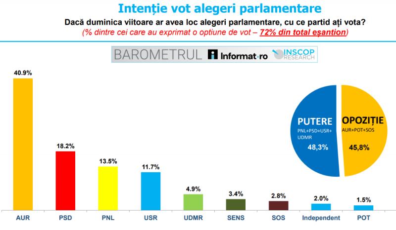 Sondaj INSCOP: Dacă ar avea loc alegeri parlamentare 40,9% ar vota AUR, 18,2% - PSD, 13,5% - PNL, 11,7% - USR
