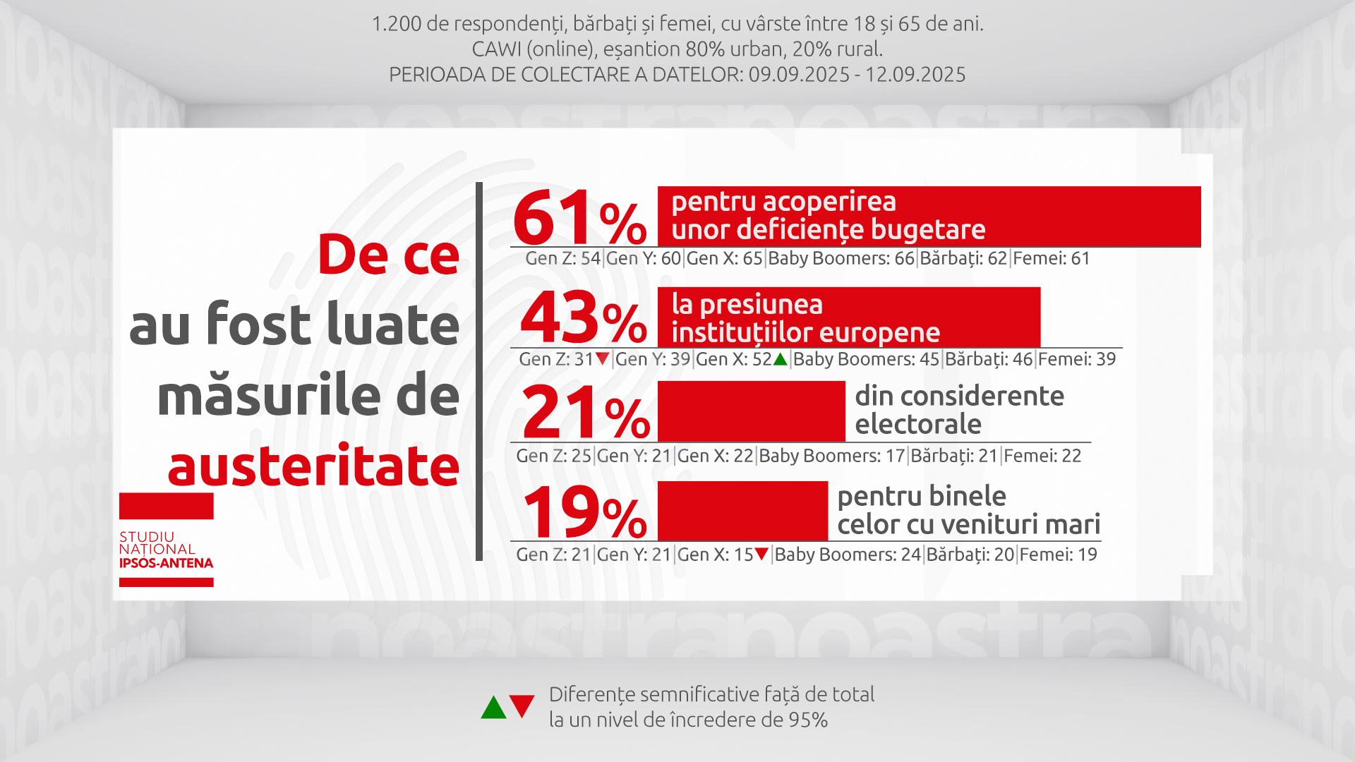 "Mă bucur că lumea a înțeles că principalul motiv este pentru că avem un deficit pe care nu-l mai permitem. Nu avem o imprimantă de bani unde putem să cheltuim orice. Asta cu 21% care cred că măsurile de austeritate au fost luate din considerente electorale mi se pare interesantă, pentru că nu știu care măsura e atât de populară. Aș întoarce-o și aș spune poate măsurile pe care încă n-am reușit să le luăm."