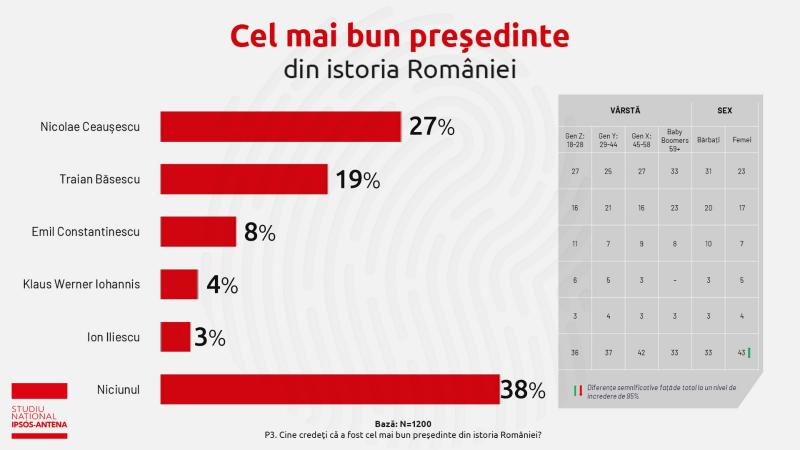 Rezultatele au fost şocante. 82% dintre români şi-au pierdut încrederea în politicieni, 38% dintre ei cred că niciun preşedinte nu a fost bun, iar primul în topul eficienţei este Nicolae Ceaşuescu. Rezultatele însă sunt şi mai şocante în amănuntele demografice din spatele acestor procente.