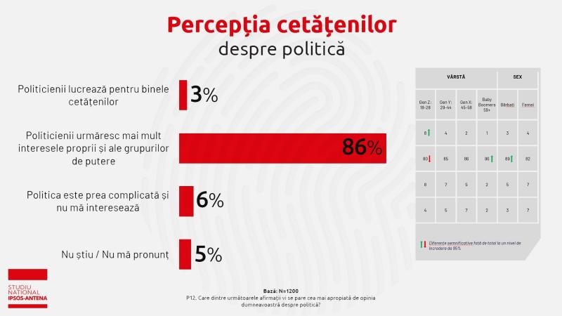 Şi plecăm de la cifre - poate cea mai importantă - 86% cred că politicienii urmăresc mai mult interesele proprii şi ale grupului din care fac parte. Iar cei mai vehemenţi respondenţi sunt cei din generaţia "baby boomers" care manifestă un nivel ridicat de neîncredere, ei cred că fără îndoială clasa politică nu se uită la binele societăţii.