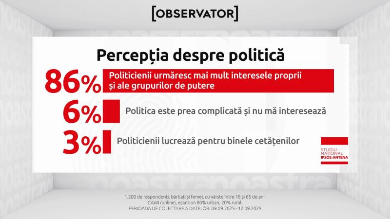 La aproape un an de la alegerile prezidențiale, viața românilor e tot mai grea. Mulţi sunt furioși, dezamăgiţi şi extrem de pesimiști. Si pentru toate astea îi găsesc vinovați exclusiv pe politicieni. Care sunt corupți, mincinoși, hoți și, în principiu, nu își văd decât propriile interese. E rezultatul Studiului Național Antena „Toată Romania Noastră”, prezentat luni seară în exclusivitate la Observator, într-o ediție specială a principalului jurnal în care Alessandra Stoicescu l-a avut invitat pe președintele României, Nicușor Dan.