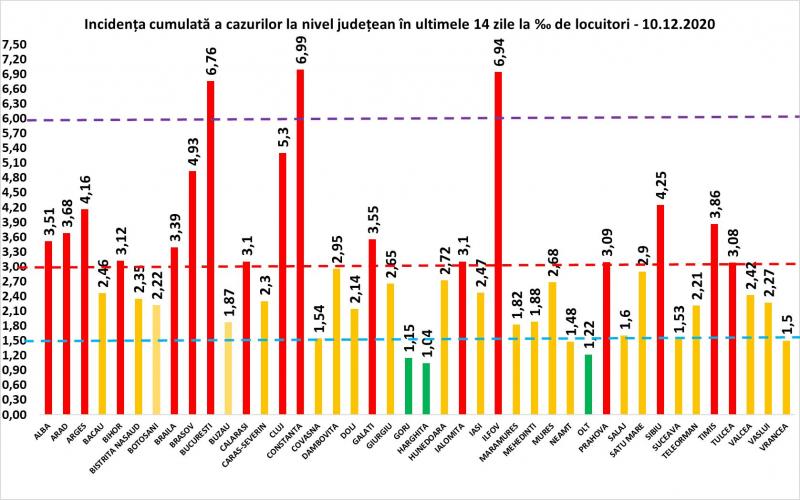Incidenţa cumulată a cazurilor la nivel judeţean - 10 deecmbrie 2020